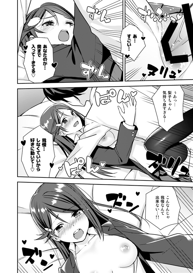 愛おし気にチ○ポをしゃぶる梨子、体勢を入れ替え正常位で繋がり貪るようにピストン♪